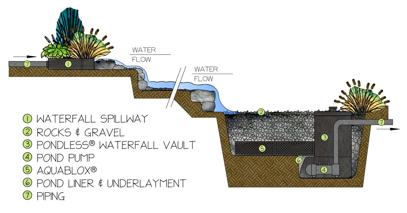 Pondless waterfalls are exactly that. Instead of a pond at the bottom of the system, the water runs into an underground reservoir built out of Aquablocks (similar to soakaway crates). The aquablocks house a pump vault, which houses the pump and water is pulled up through PVC pipework to a spillway, which is concealed within the rockwork at the top of the feature. The water then cascades down the waterfall back into the reservoir, and the cycle continues.